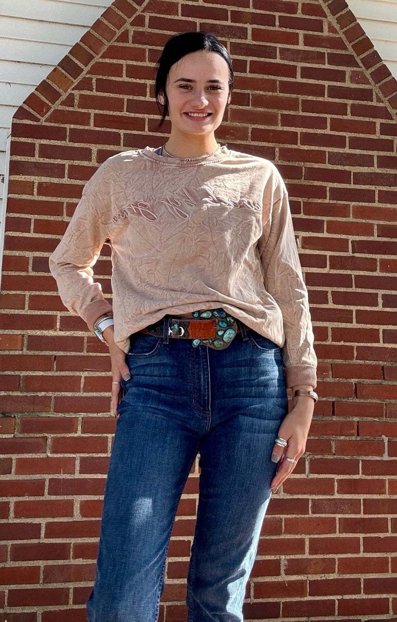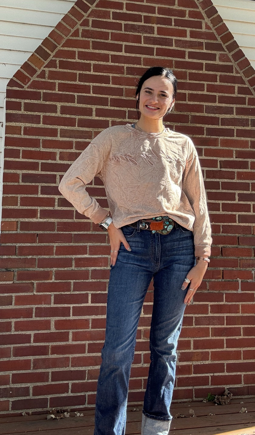 This crew is neutral and perfect to dress up or down! Also would style well layered.