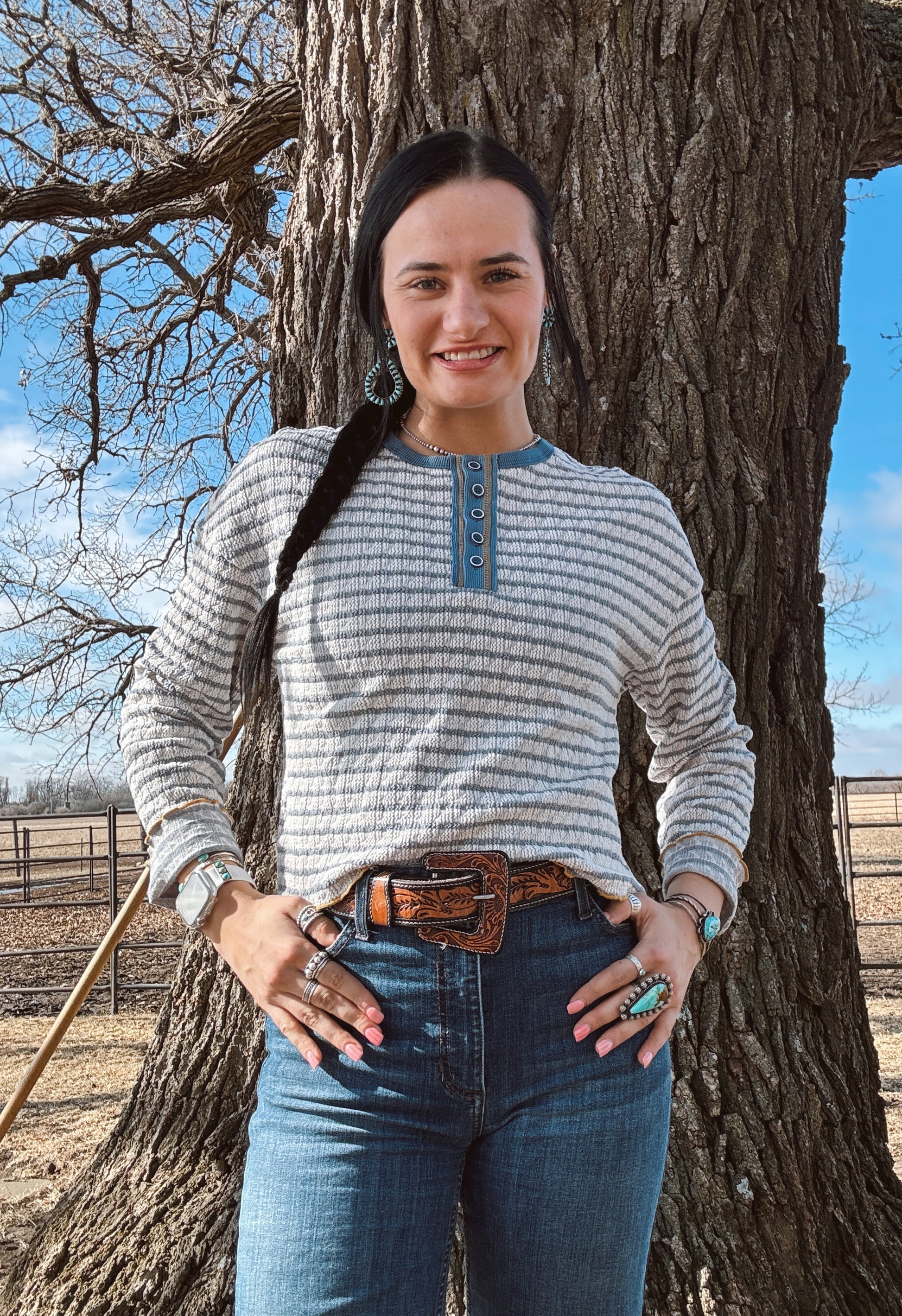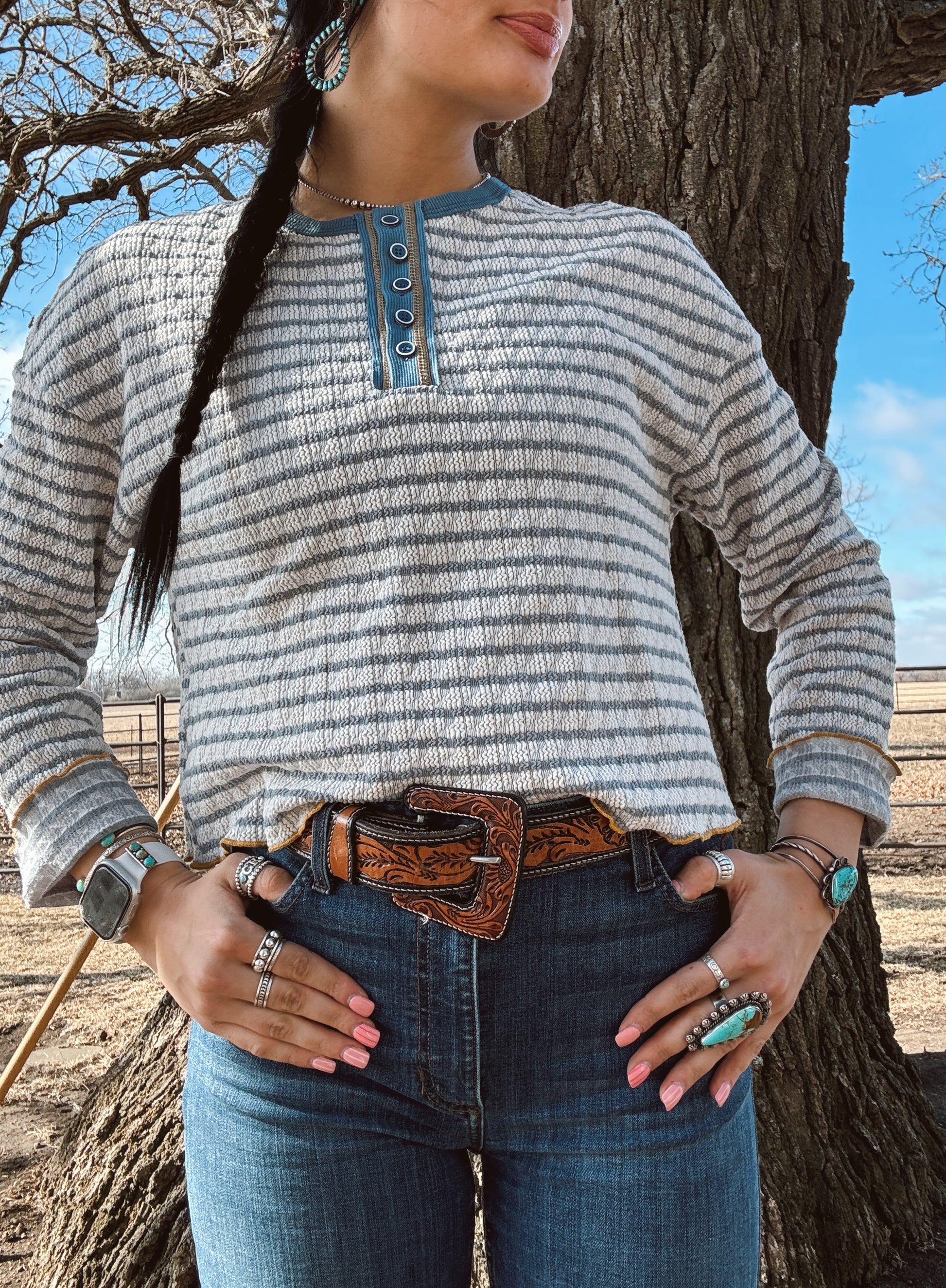 This blue and white striped long sleeve with yellow accents is PERFECT!