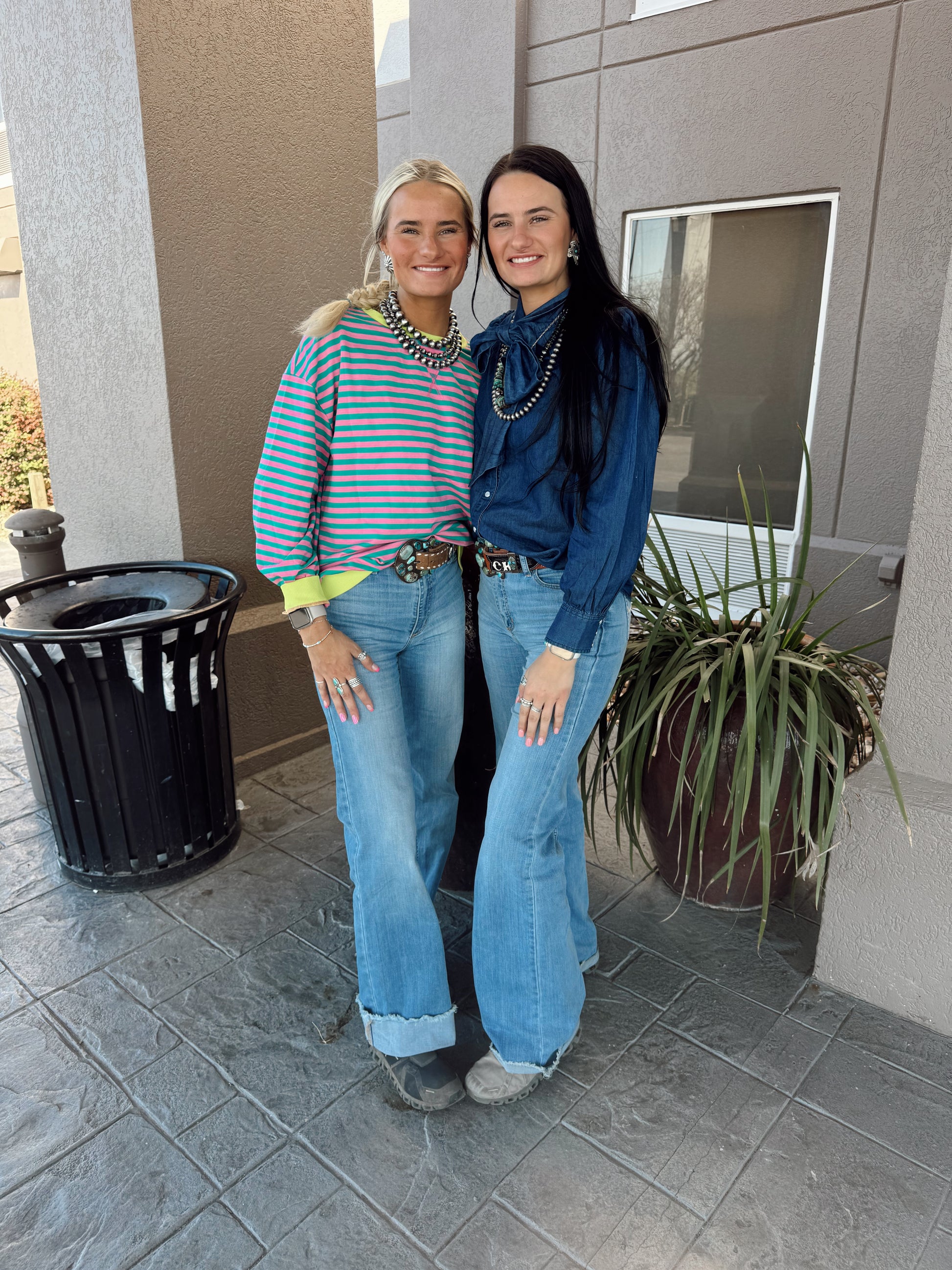 This green and pink striped top is a staple! So easy to dress up or down. True to size.