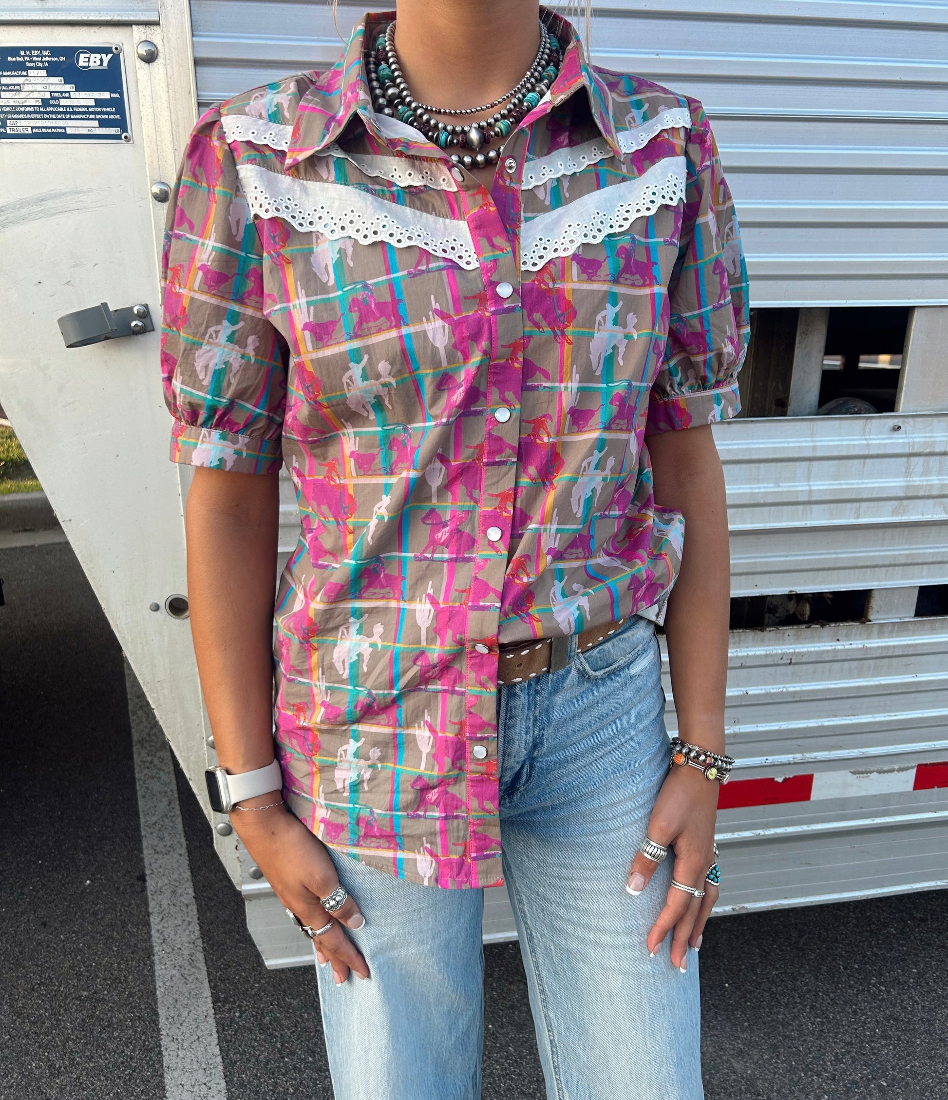 This shirt has ALL the details! The colors, the lace, the pearl snaps, everything about this shirt is perfect! True to size. It also has a little bit of stretch.