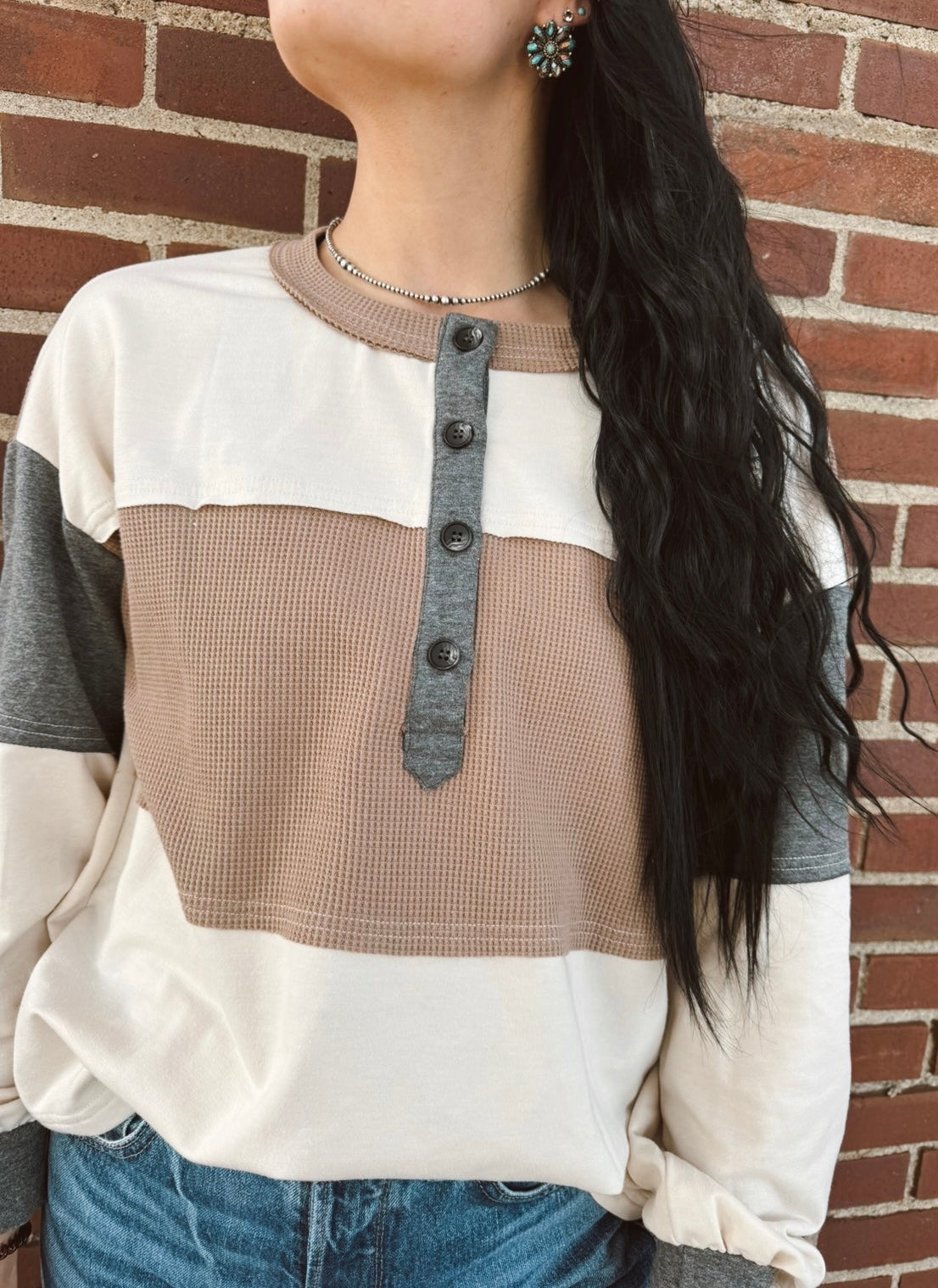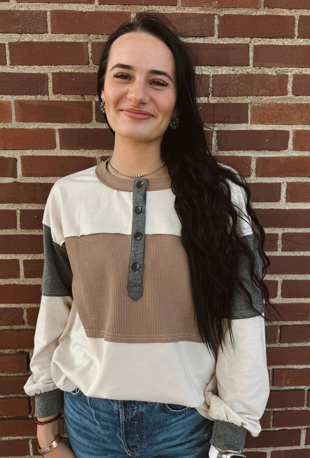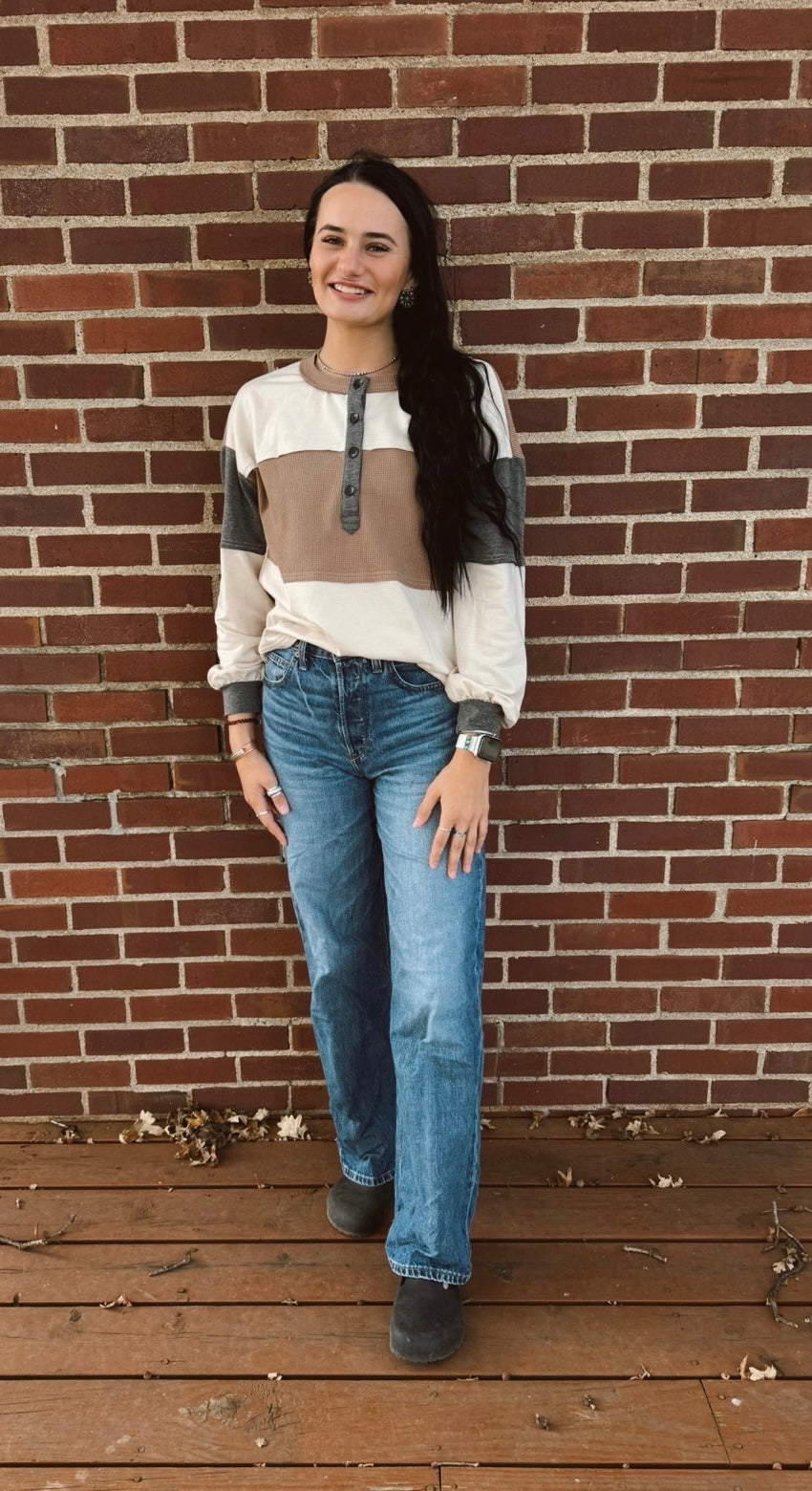 This color block long sleeve is perfect for the cooler weather! You can dress any outfit up or down with this top.