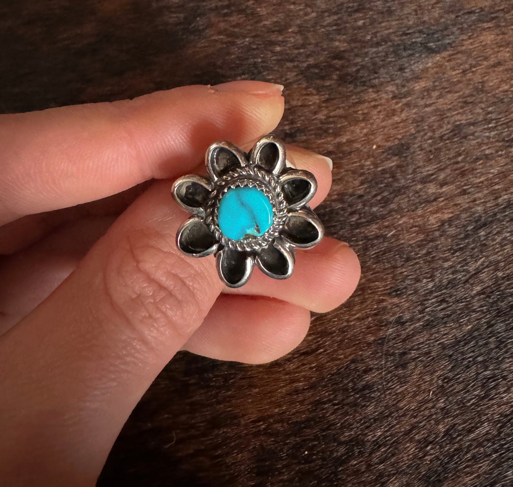 This ring is perfect for any stack, adds fun and color to your hand! Pairs perfect with the Turquoise Flower Studs. Size 9 3/4